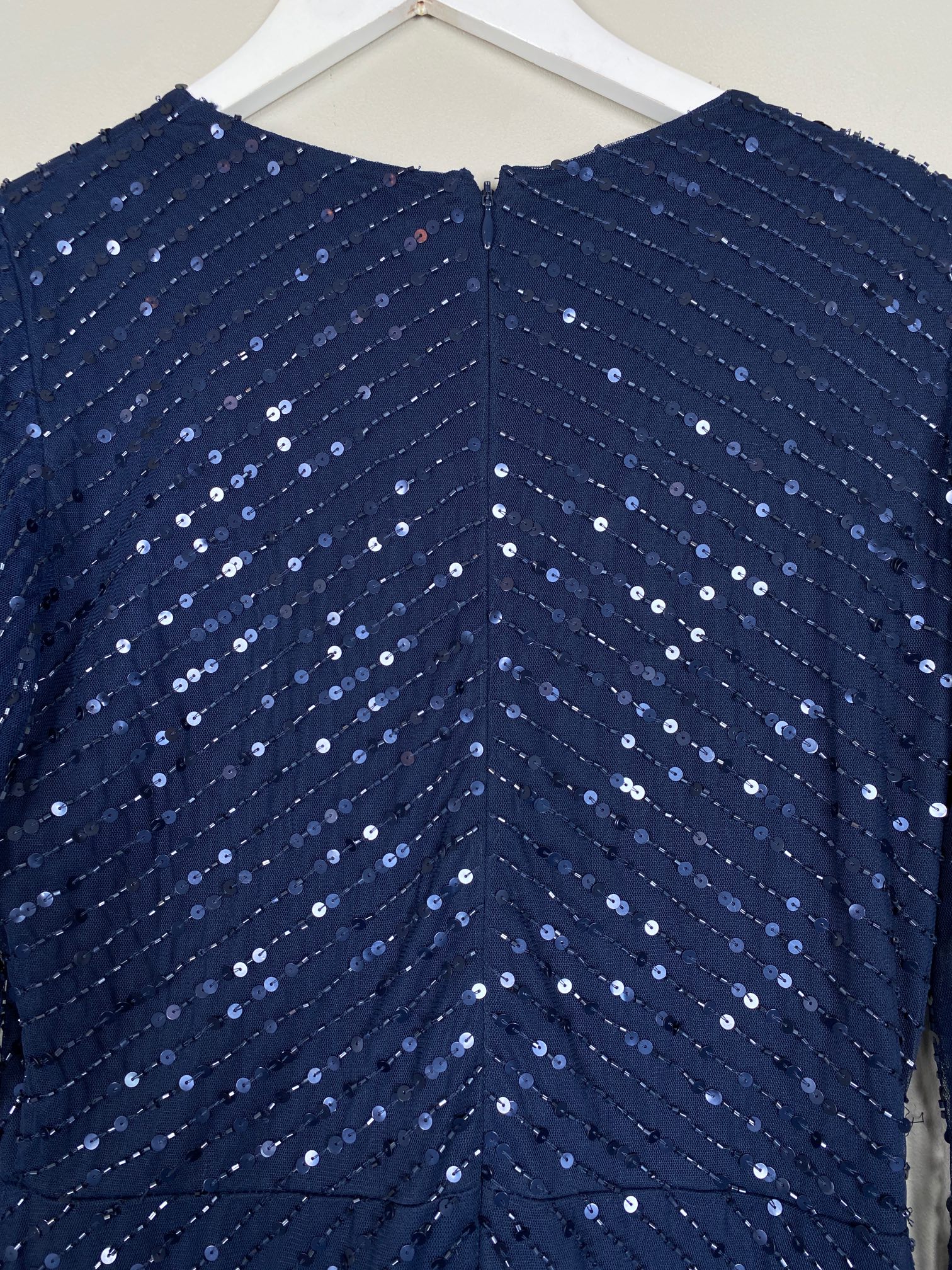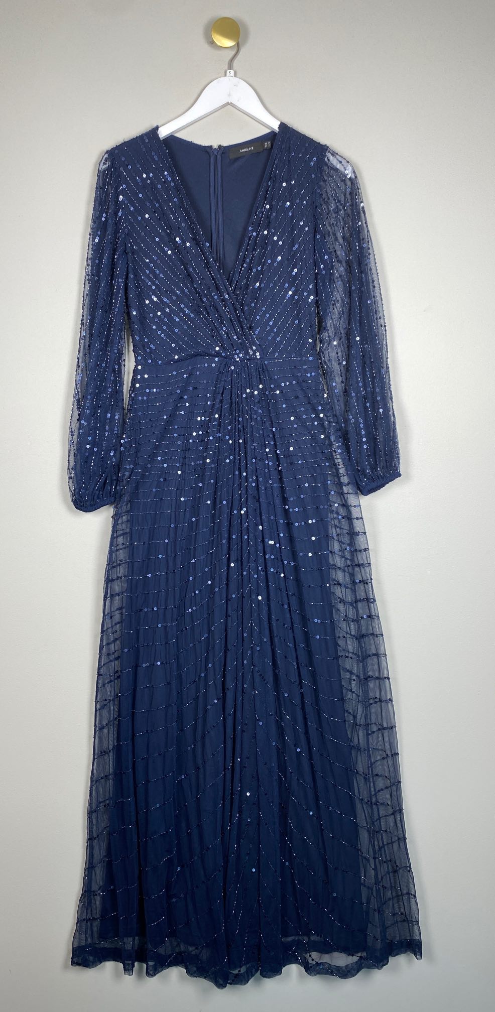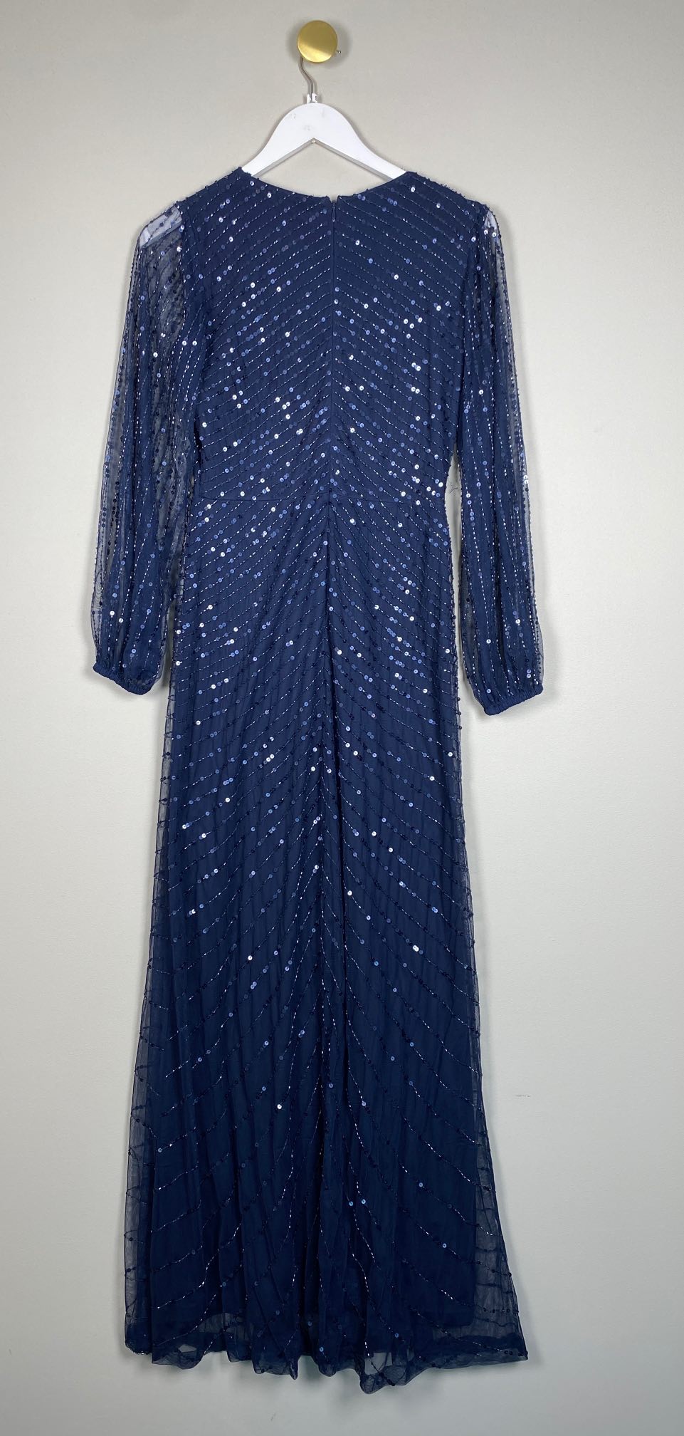lang blå festkjole med pailletter og perler
