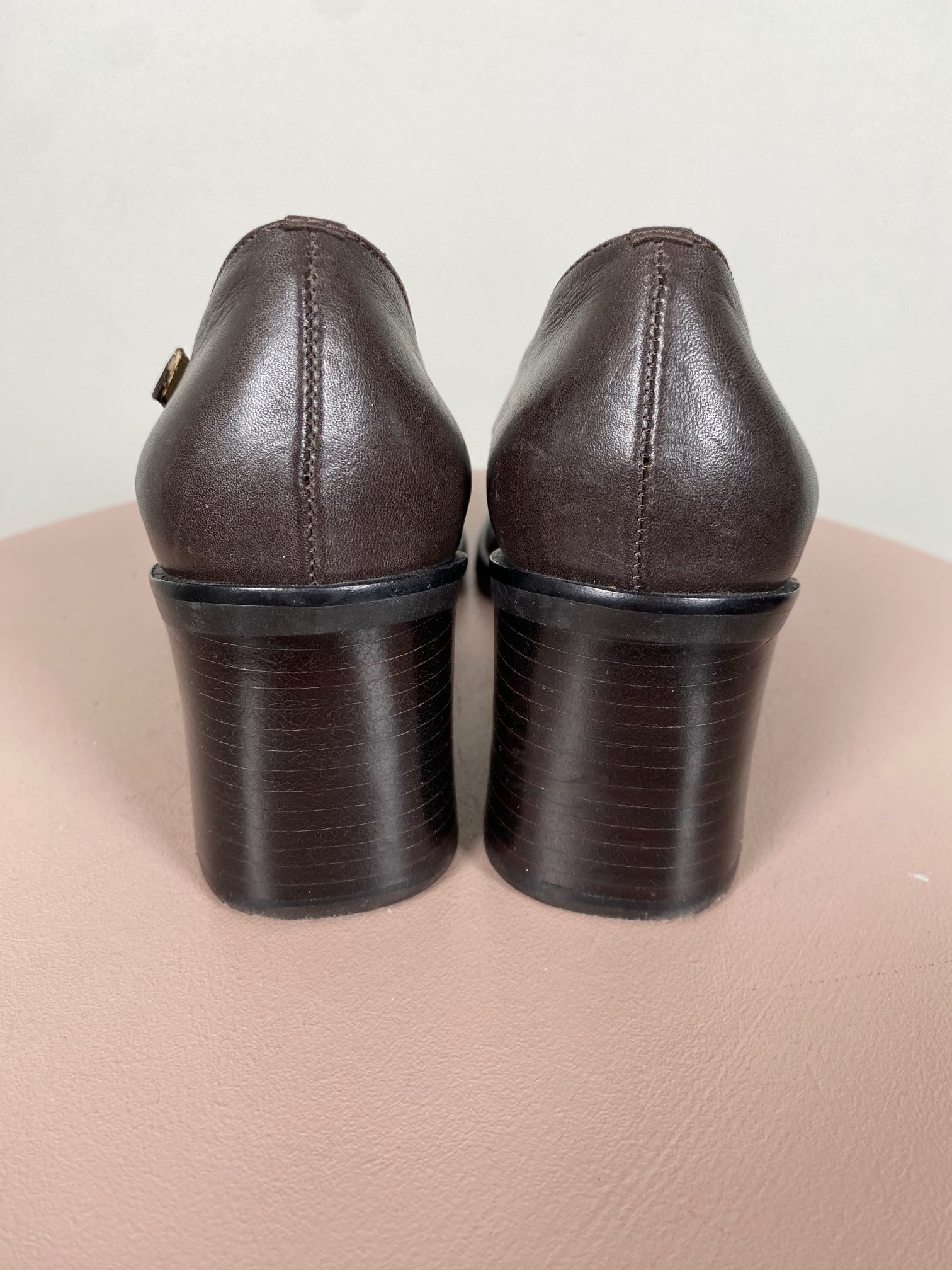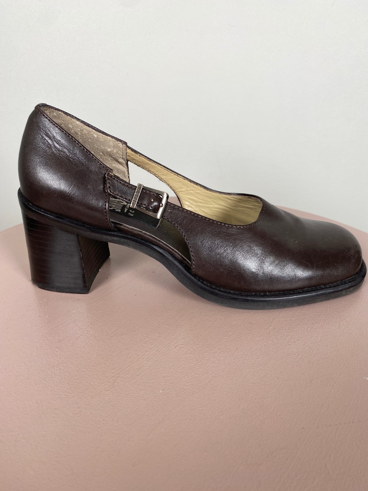 brun pump med spænde ved side