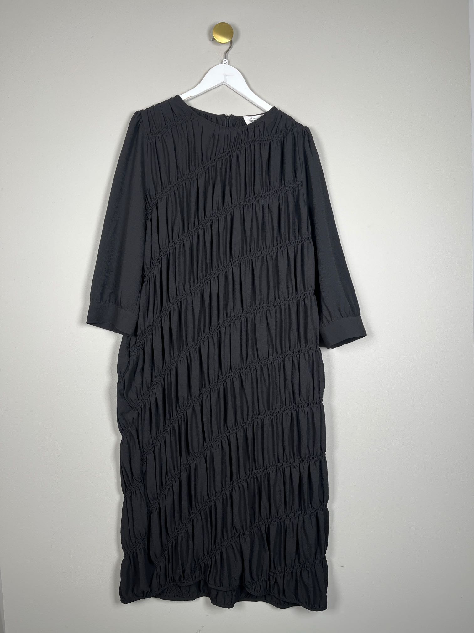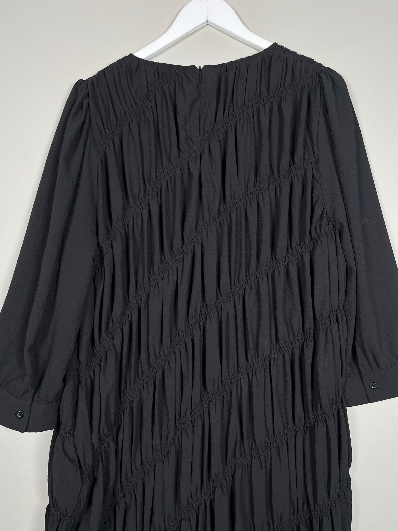 sort kjole I crepestof med elastisk rynkeeffekt